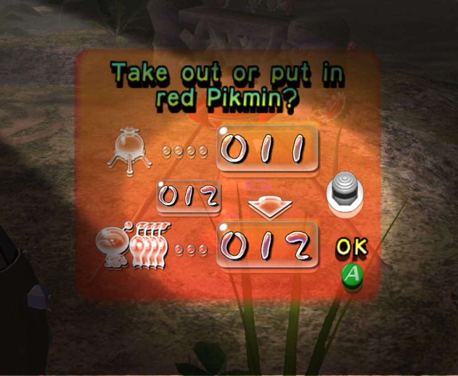 So different coloured button things sprout different coloured Pikmin. That much is obvious. What isn't obvious is where those buttons go. You'd think that the yellow things would always and only enter the yellow Onion, but no. They'll go wherever the Pikmin carrying them take it, and it is the colour of the Pikmin that determine where they go. If they go in the wrong Onion, they sprout the wrong colour.