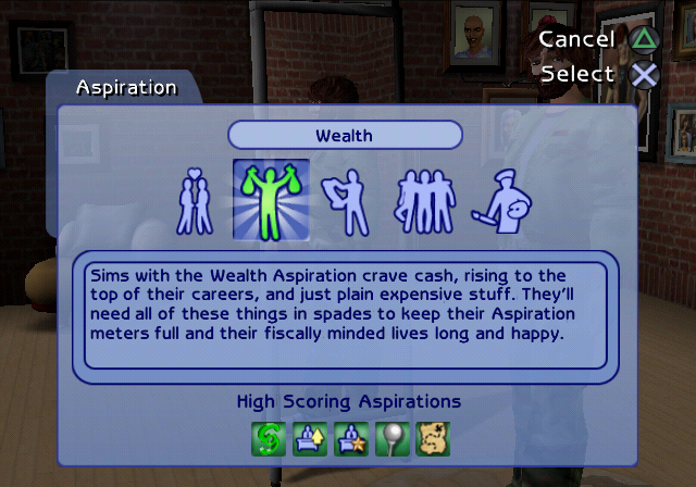 In amongst the clothing and whatnot is an aspiration menu. Finally, we're getting somewhere. What does my digital self want? Probably wealth. It's not the answer to life, but it does make it easier, doesn't it?